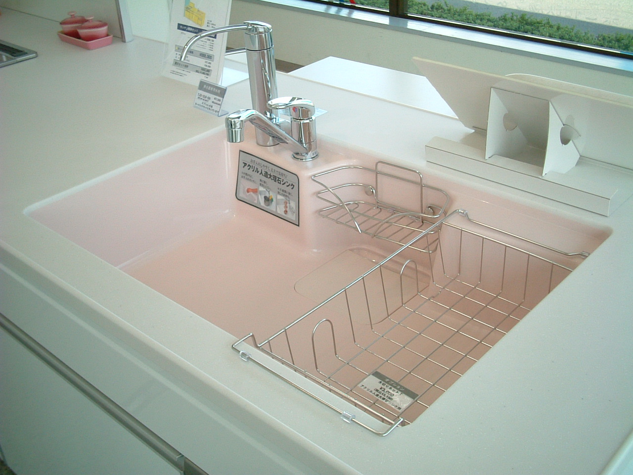 ホワイト色 に ピンク色 の シンク。 男の 健さん が 見ても かわいい~ と 思いますねー。