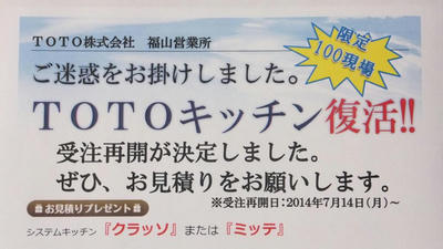 TOTOキッチン復活!!と 書かれた システムキッチンの受注再開を