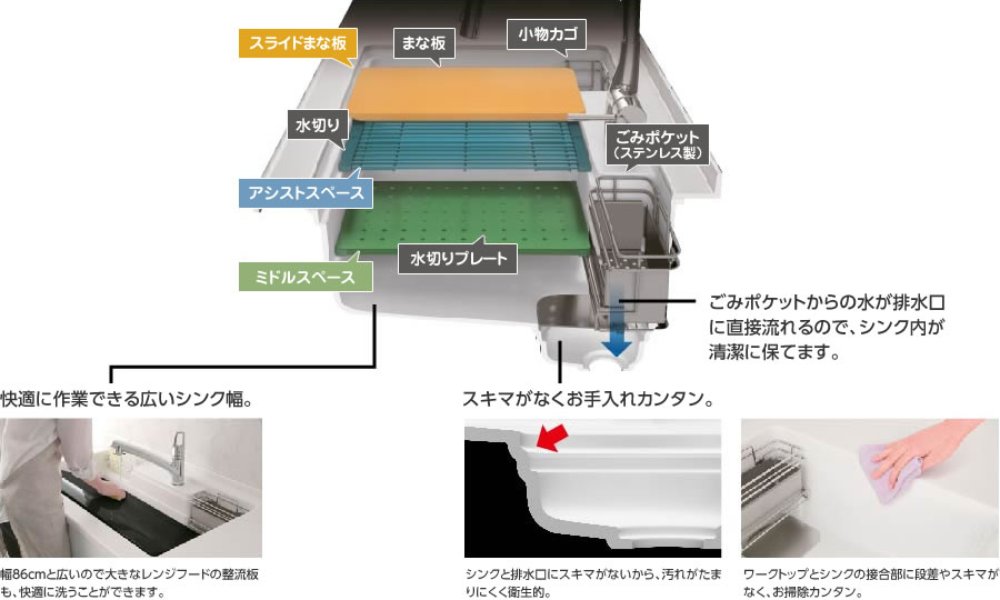 素材で出来たシンクが3層構造になっておりまして・・・ これが 業界初 なんです。