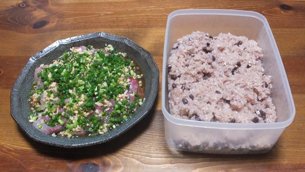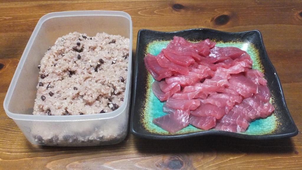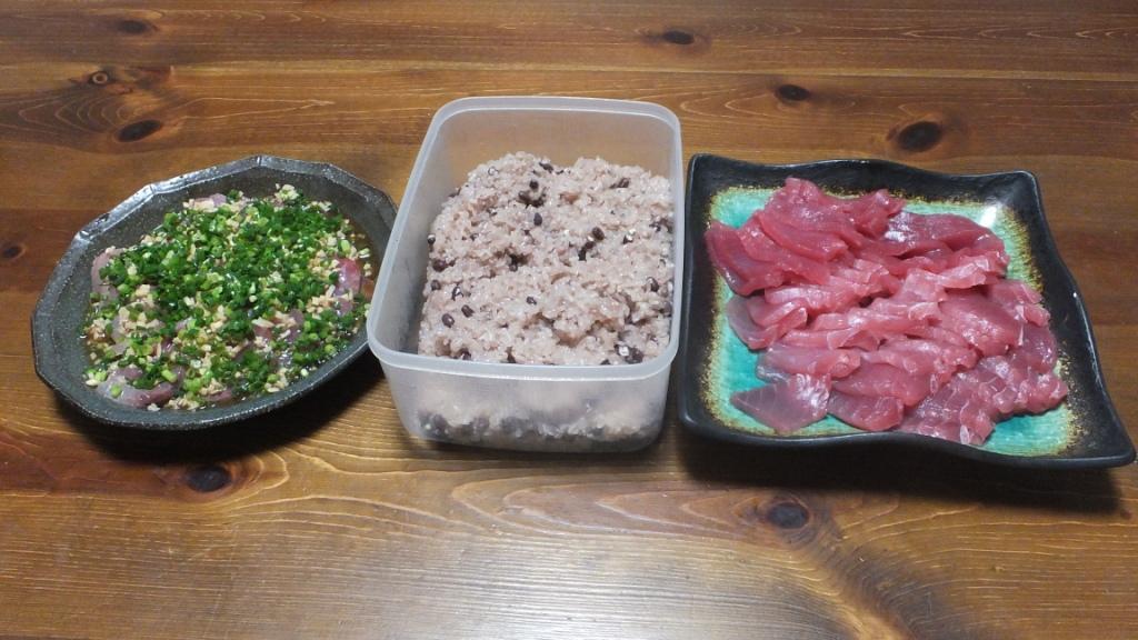 食卓に並んだ 赤飯 と お刺身等の料理、 そうです 本日、5月18日は、健さん