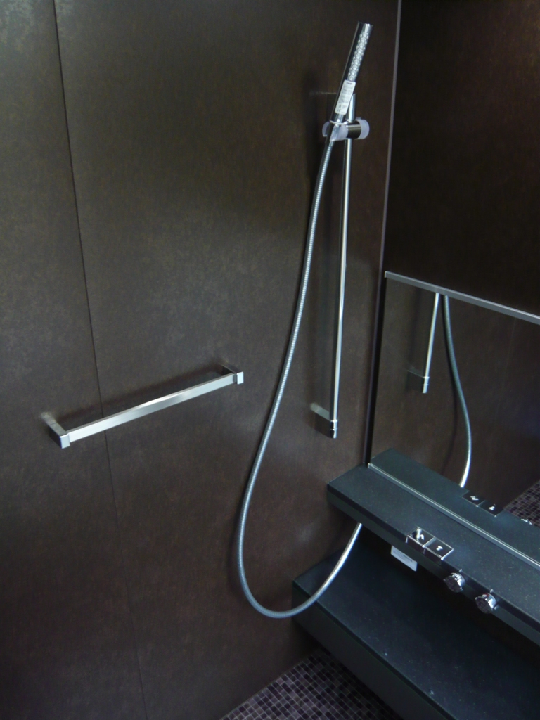 フックは、横の壁に付いています。シャワーヘッドもスタイリッシュな