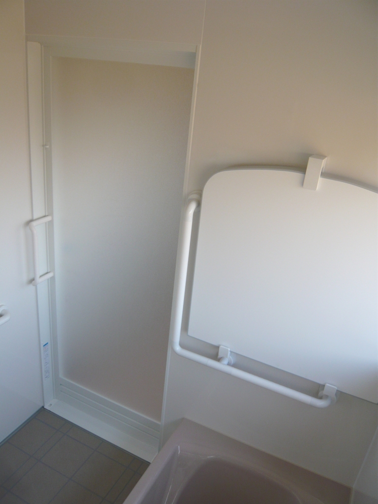 同様に 浴槽から出る時に便利な風呂蓋フックも兼ねた L型手摺り も