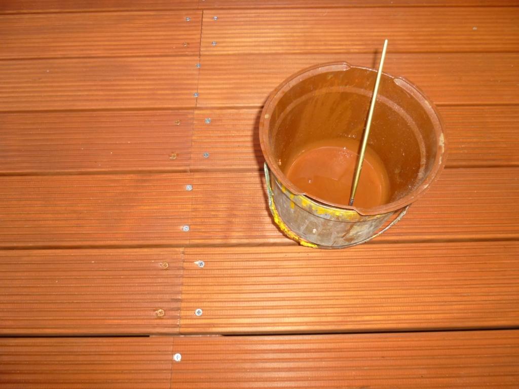 ビスを打った所の処理も 匠(営業マン 健さん)みずから 木材保護塗料を