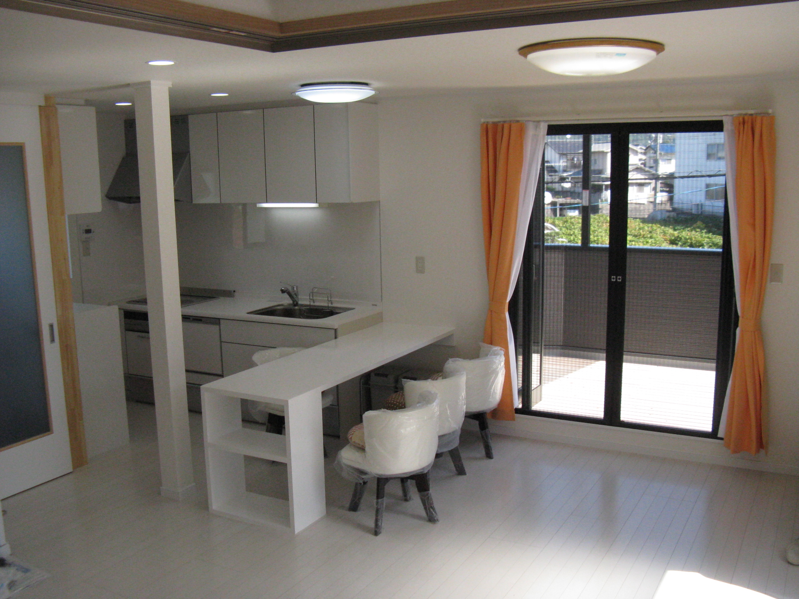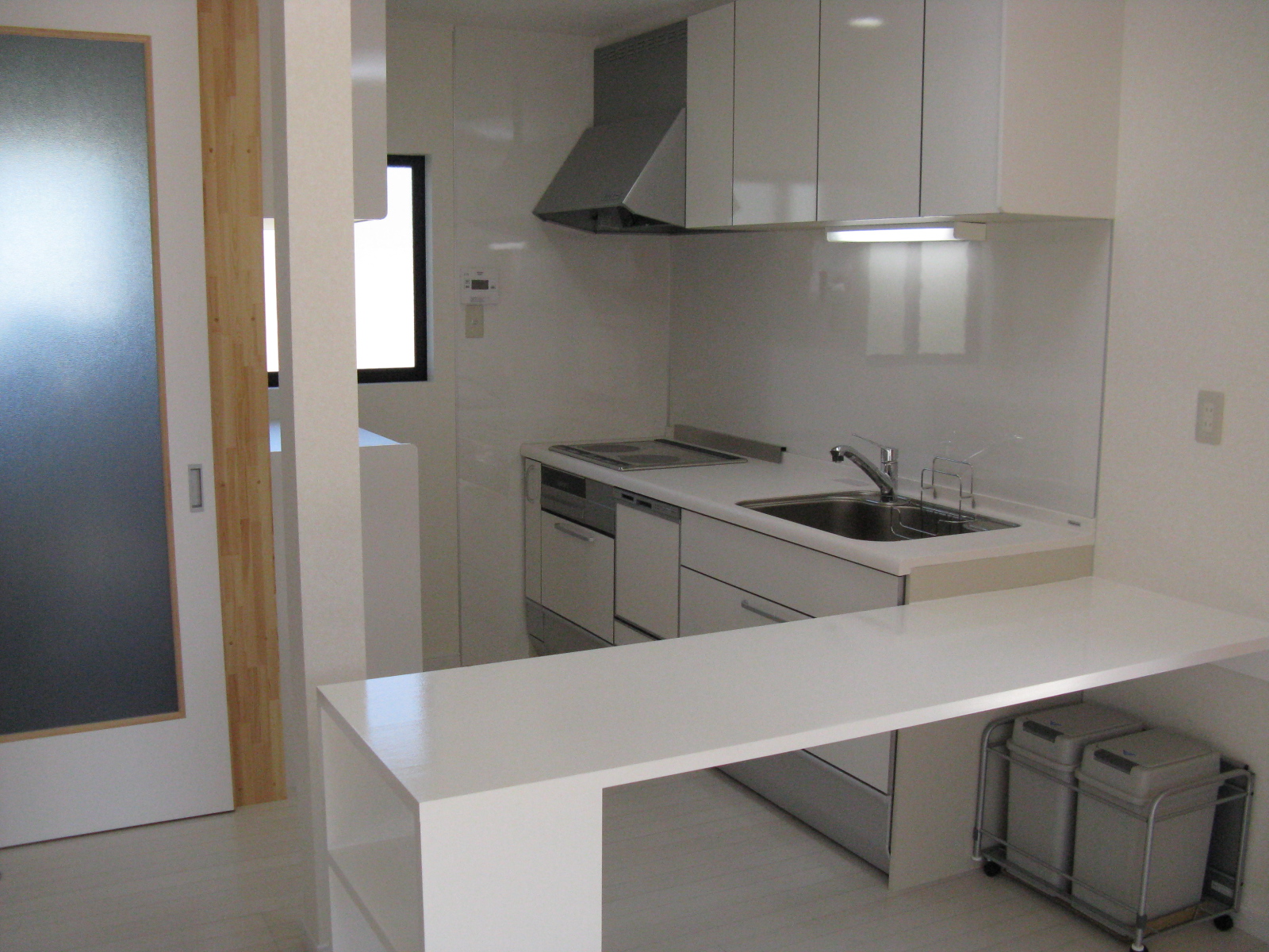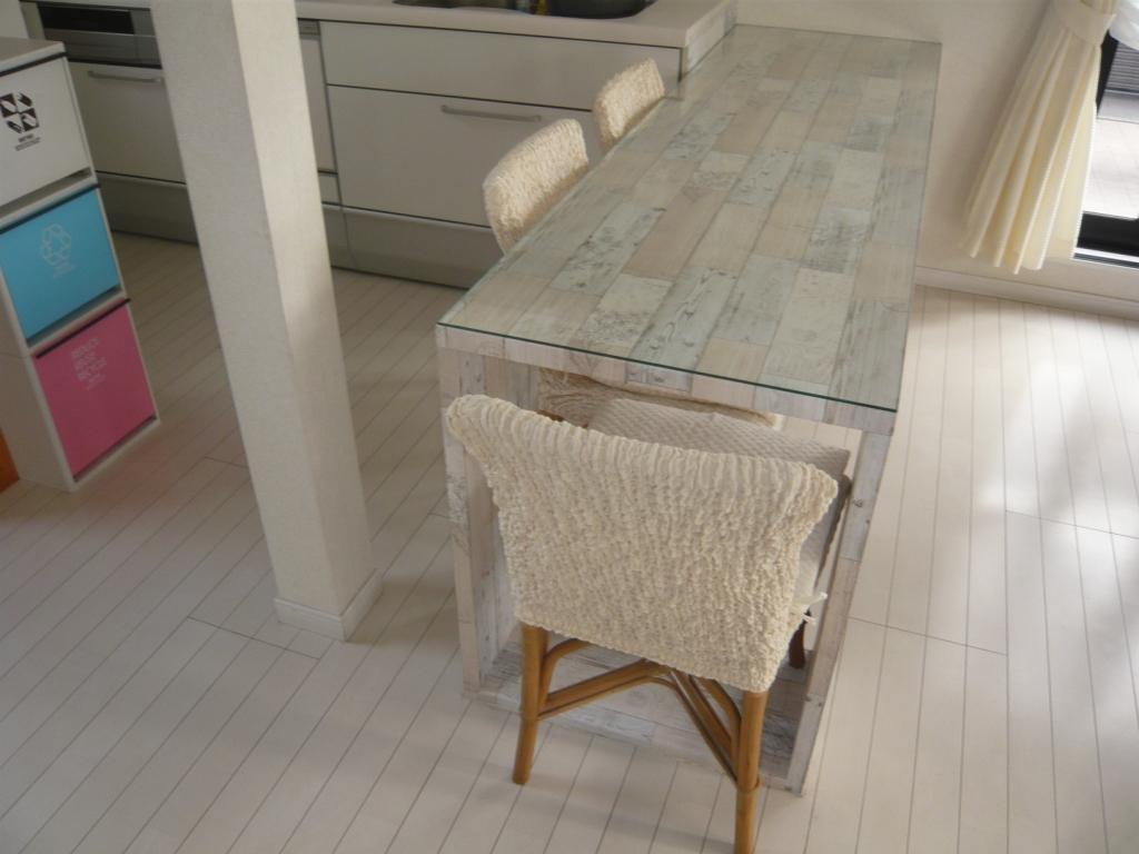 工事の際、集成材で製作した配膳カウンターも兼ねたテーブルは、白い