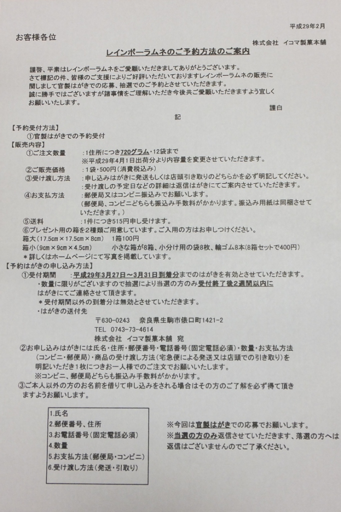 上の申込み方法が見にくい場合は、イコマ製菓本舗さんのホームページをどうぞ。