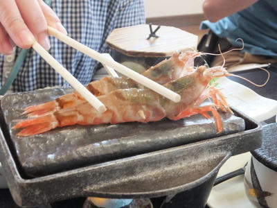 もさえび尽くしの料理のメインが 活もさえび を 豪快に焼いて食べると言うもので